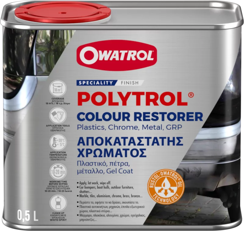 Αναζωογονεί το χρώμα και την εμφάνιση θαμπωμένων και θολωμένων πλαστικών και φάϊμπεργκλας (GRP) ( προφυλακτήρες αυτοκινήτων, σκαρί του καραβιού, έπιπλα κήπου, παντζούρια).